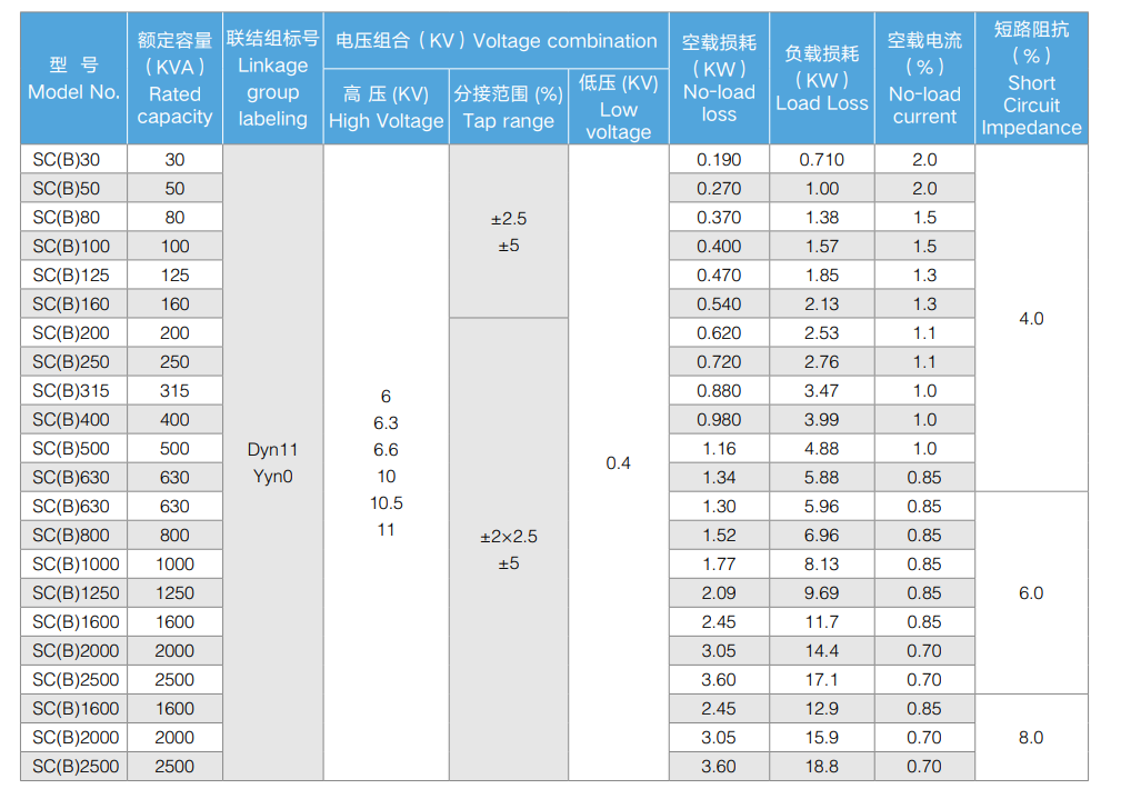 SC (B) 18 6KV, 10KV 30KV · A ~ 2500 KV · A