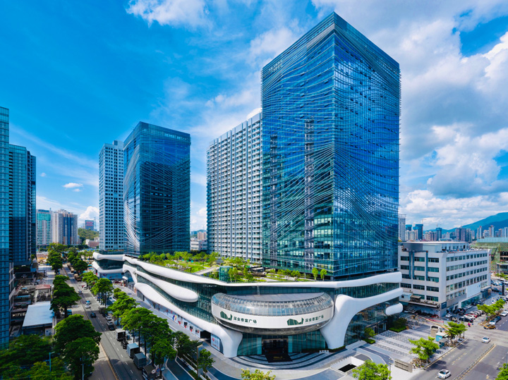 Современные здания со стеклянными навесными стенами в городе, с коммерческими зелеными насаждениями на дне, обеспечивают здания электрооборудованием.