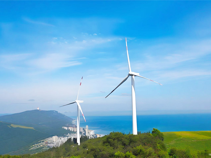 Ветровые турбины стоят между горами и морем, с ясным небом и городским океаном, чистыми энергетическими установками.